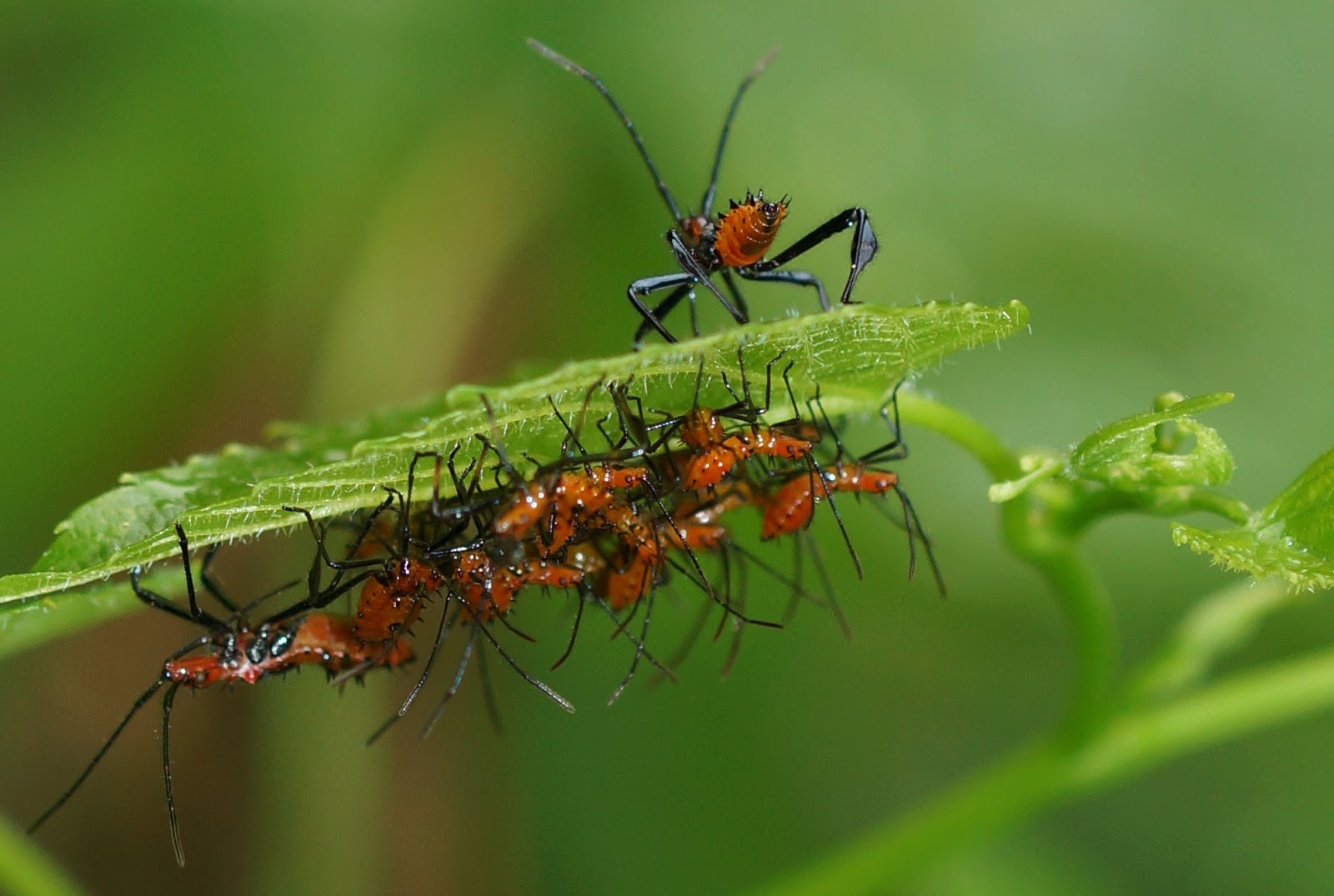 For most insects, tiny bug nymphs pose a negligible threat. The threat is hardly increased when the nymphs are in a group (which they often are). However, unlike the beetle being assailed by the stink bug, there are some potential victims that lack the mobility to attempt an escape.